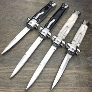 Get the best of both worlds with the Stiletto OTF automatic. This knife brilliantly combines the classic style of an Italian stiletto and the tactical speed of an OTF. A front-loading thumb slide fires and retracts the blade with smooth automatic precision. Add a unique design to your collection with the 9″ Stiletto OTF Auto.