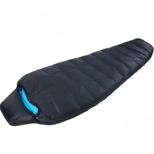 Portable outdoor down sleeping bag for camping and keeping warm.